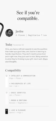 • For couples, Eros, a feature that gives you insight on how to navigate everyday relationship situations based on your zodiac compatibility.