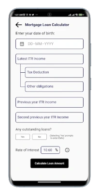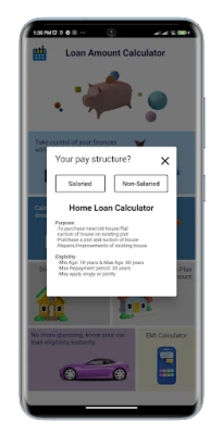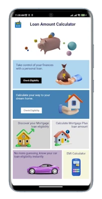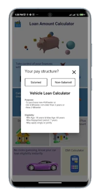 Introducing the Loan Amount Calculator App - your one-stop solution to calculate your eligible loan amount based on your income and outgoes. Our app offers a variety of loan amount calculators, including Personal loan calculator, Home loan calculator, Vehicle loan calculator, Mortgage loan calculator, and Mortgage plus loan calculator, for both salaried and non-salaried individuals.